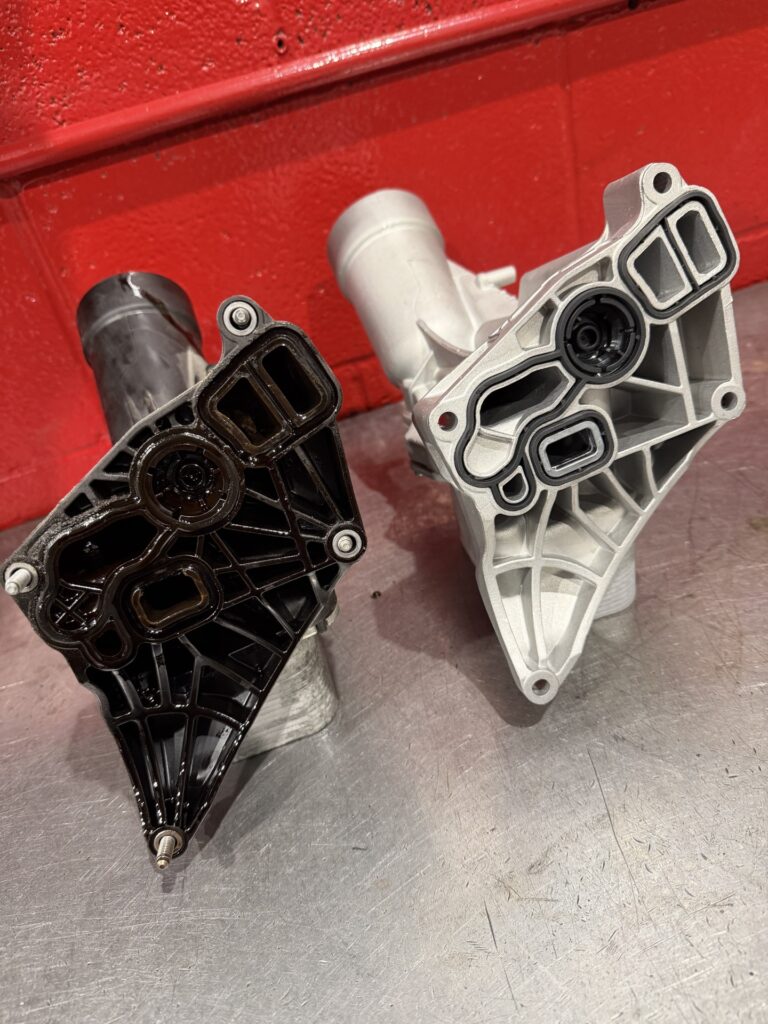 These engines use a composite oil filter housing with integrated oil and coolant passages, making it a critical component for both lubrication and temperature control. Over time, the housing is prone to: